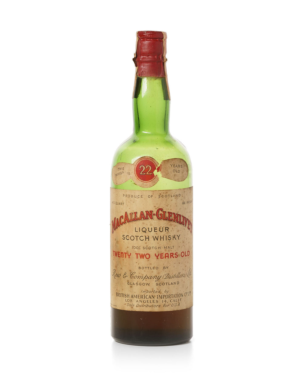 The whisky liqueur was bottled by Row & Company Distillers Ltd. in the 1940s for the American market, and imported by the British American Importation Co. Ltd. The importation of this whisky followed the 1920s Prohibition, the Second World War, and The Great Depression. It is one of the oldest bottles of Macallan ever released to the public. In 2022, the bottle was on offer at Bonhams with an auction estimate of £6,000-£9,000.