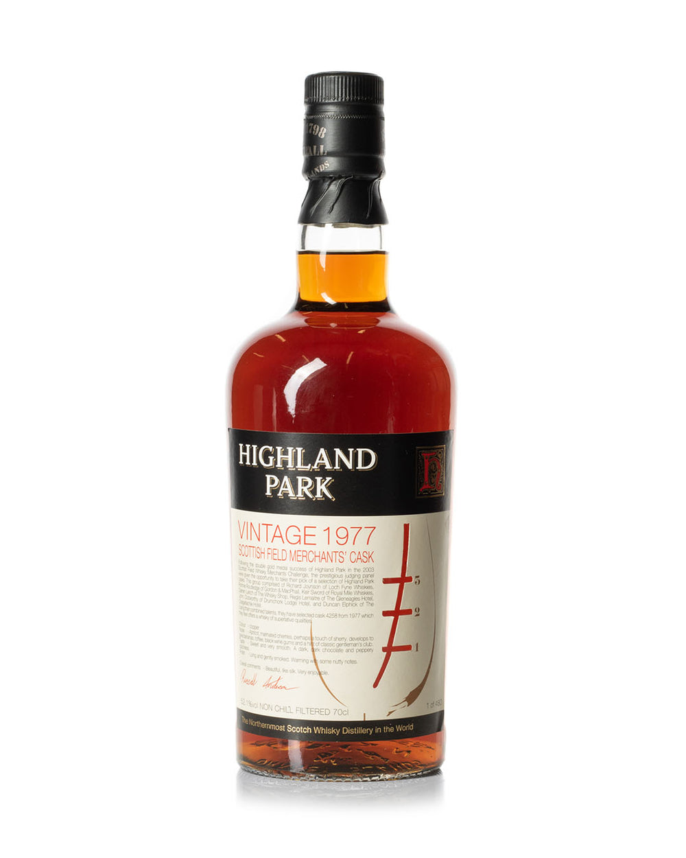This cask strength Highland Park was distilled in 1977 and drawn from a single cask, #4258. In 2003 Highland Park achieved a double gold medal in the Scottish Field Whisky Merchants challenge and to commemorate this the judging panel were asked to pick from a selection of Highland Park casks, creating this bottling. As such, the bottle and box also feature a tasting glass design.