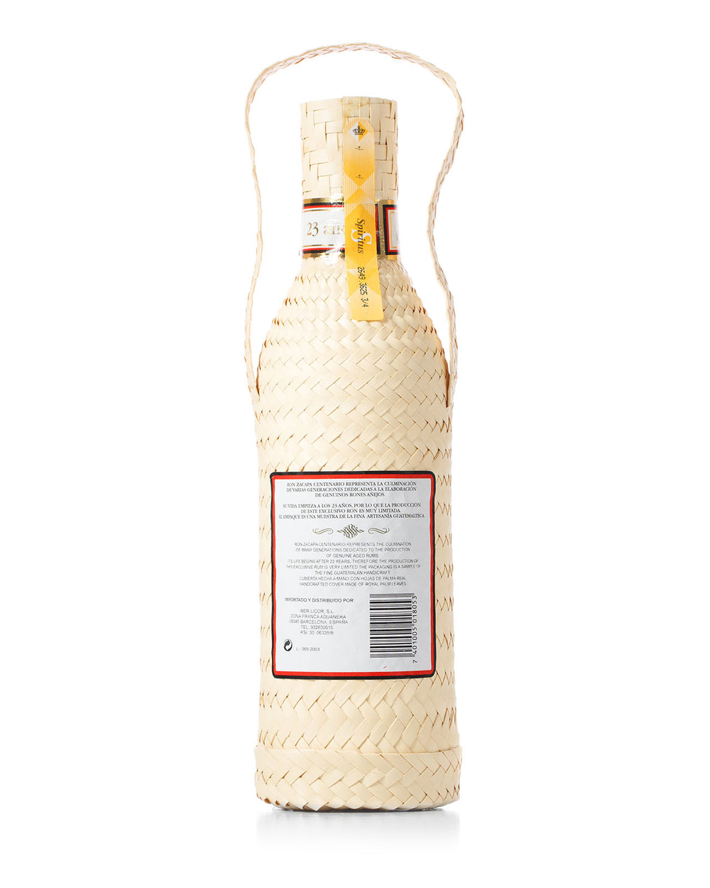 This is a bottle of Ron Zacapa Centenario 23 Year Old  Guatamalan Rum, 75cl, 50% abv. The bottle is wrapped in a hand-woven 'petate' made from palm leaves.