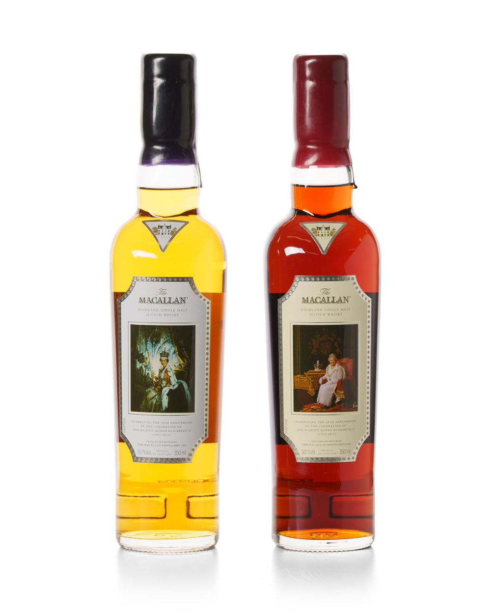 这对酒瓶于 2013 年发布,以纪念 1953 年伊丽莎白女王加冕 60 周年。酒瓶装在由 David Holmes 设计的令人惊叹的红色盒子中。每瓶都代表了伊丽莎白女王统治时期的不同时期,并装饰着那个时期的伊丽莎白女王肖像,第一幅是她在 1953 年的肖像,第二幅是她在 2013 年的肖像。这是一款精美的纪念瓶,仅限于只有 1,953 双。